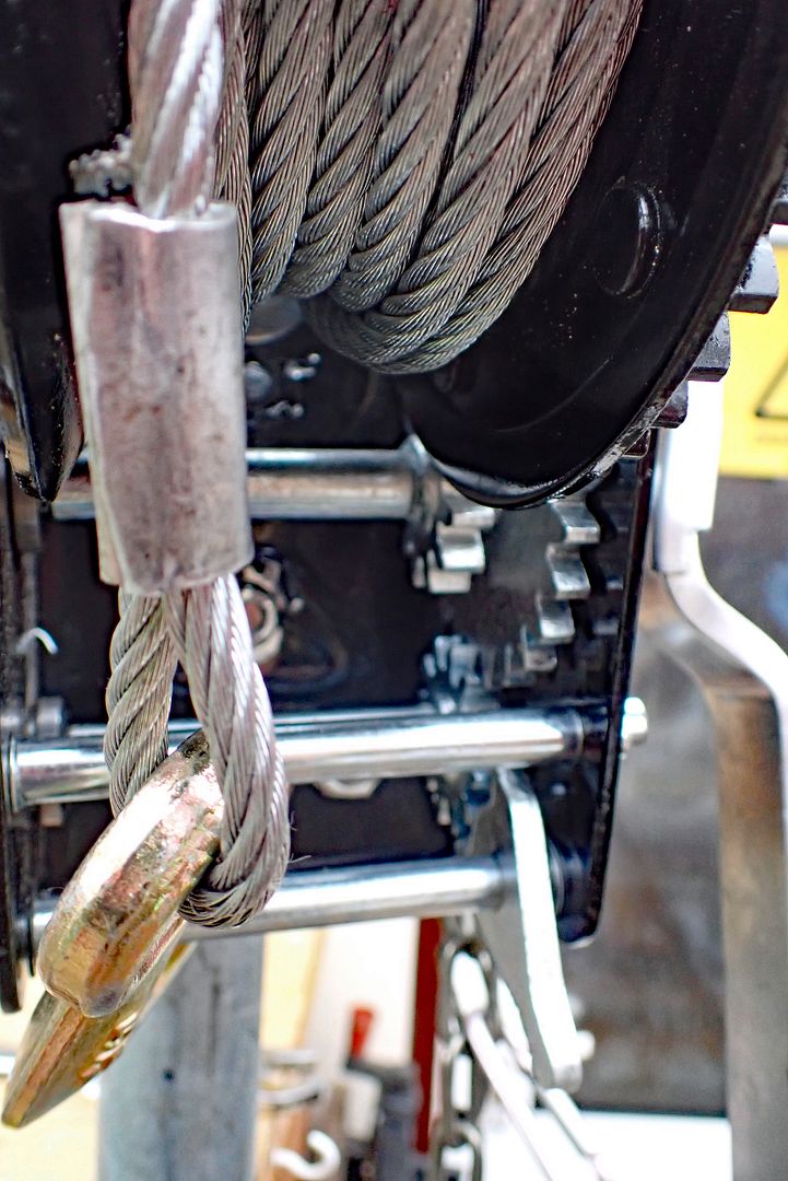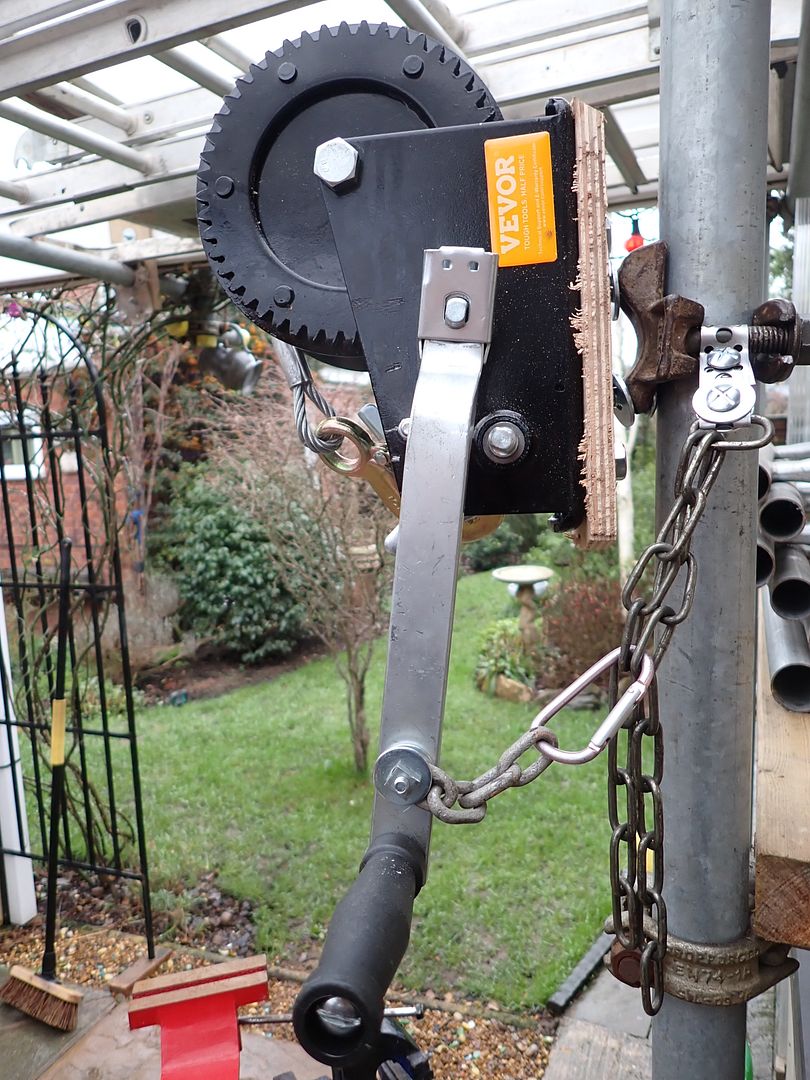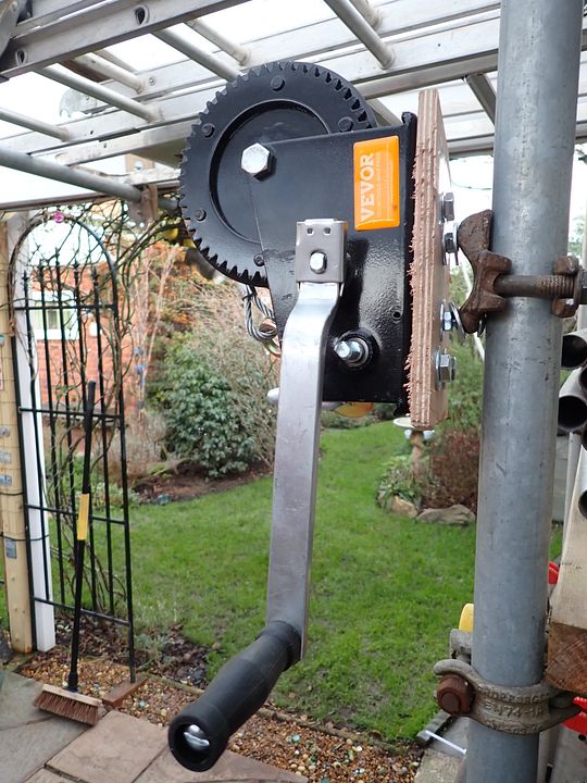 Using a tape winch for tub hauling in Reservoir Hole worked fairly well. The dig at QWUH is about 8 metres deep and hauling the tub up needs two people. It becomes very tiring with a muddy rope after a short while. I thought that we could try a wire winch ( £31 on Amazon ). Getting it in place is the issue. To overcome this I have mounted the winch on half a scaffold clip. That will then sit on a vertical pole on a base jack to the roof. The winch can be moved up or down and sideways with the pole. It can be removed quickly as not bolted to a wall. In test the winch lifted a weight one metre per ten seconds. That of course depending on how quickly you turn the handle. In theory hauling fatigue is eliminated and larger loads can be lifted. The ratcheted load cant be dropped back down the dig. Will give at a try on Tuesday no doubt in practice something I have overlooked will occur.